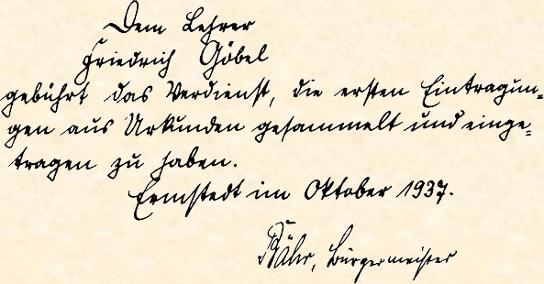 Dem Lehrer Friedrich Göbel gebührt das Verdienst, die ersten Eintragun- gen aus Urkunden gesammelt und einge- tragen zu haben. Ermstedt im Oktober 1937 Bähr, Bürgermeister |