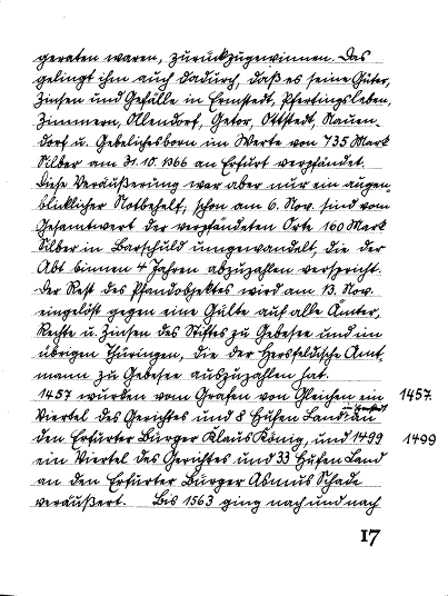 Dies mag als Beispiel reichen - die Chronik geht dann weiter bis zur Seite 97, wobei meist nur die ungeraden Seiten beschrieben sind - hin und wieder werden auf geraden Seiten Ergänzungen gemacht, die ich nicht zusätzlich übertragen habe. Im übrigen liegt mir die Chronik auch nur als Photokopie beschriebener Seiten vor - wer das Original hat und ob es überhaupt noch existiert, weiß ich nicht zu sagen. Ich übertrage den Wortlaut wertfrei aus der damals üblichen deutschen Schreibschrift, da ich annehme, das nur ein geringer Teil der Leser dazu in der Lage ist … im übrigen ist es unverständlicherweise den alliierten Besatzungen nach dem 2. Weltkriege geschuldet, daß die deutsche Schreibschrift dauerhaft in Vergessenheit geriet. Es war sicherlich nicht deren unmittelbares Interesse, dem „Führer“-Erlaß vom 3.Jan.1941 zu folgen, nachdem zukünftig nur noch sog. Normalschrift (also lateinische) zu gebrauchen wäre. Allerdings haben die Alliierten die Verwendung deutscher Schriften weiter verboten - vielleicht weil sie sie nicht lesen konnten? (http://de.wikipedia.org/wiki/Antiqua-Fraktur-Streit#Normal-Schrift)