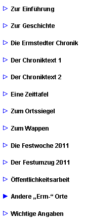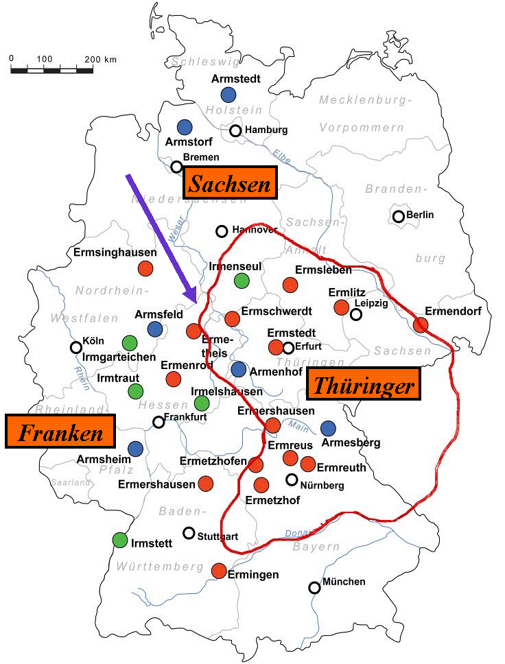 Ich habe in einem Ortsverzeichnis des Deutschen Reiches alle Orte mit „Erm-“, „Irm-“ oder „Arm-“ Präfix (Vorsilbe) herausgesucht und in eine Landkarte unserer jetzigen Republik eingetragen. Dabei ist zu berücksichtigen, daß Ortsnamen einem teilweise modisch begründeten Lautwandel unterlagen oder/und Schreibungen sich nach den jeweiligen Gebräuchen ändern konnten. Unser Dorf hieß im Verlauf auch erst Ermenstat, später Erimstete, Ermilstete, Ermbstedt, Hermstedt, Hermanstadt, Herminstedte, Herimotestat usw. usf., bis sich die Lautung und Schreibung auf das heutige Ermstedt festlegte. Anderen Orten ging es nicht anders, wie das Beispiel Ermendorf im heutigen Sachsen belegt: Ermsdorf, Ermyndorf, Ermandorf, Ermendorff, Erbendoff, Erbmannsdorf usw. oder Irmtraut im jetzigen Hessen: Ermetrode, Irmtroit, Ermentrut, Irmiterode, Yrmentrade, Ermentraide, Irmptroit, Ehrntrautt usw. Zu beachten ist dabei, daß erstens das Präfix „Erm-“ manchmal zwischenzeitlich zu „Irm-“ oder „Yrm-“ wechselte und später wieder zu „Erm-“ wurde; zweitens primäre „Irm-“ Orte eher zeitlichen Namensbestand haben oder auch manchmal aus „Erm-“ Ortsbezeichnungen hervorgegangen sind und „Arm-“ Orte teilweise aus frühen „Erm-“ Orten oder ganz anderen Namen hervorgegangen sind - (bei später gegründeten „Arm-“ Orten ist auch eine andere Quelle möglich - die Armut). Die oben genannte Lautwandlung von „Erm-“ zu „Irm-“ und umgekehrt betrifft im Übrigen auch die Orte Ermenrod, welches 1351 noch Irmenrade genannt wurde und Irmenseul, welches 1298 noch als Ermensulle bezeichnet wurde. |